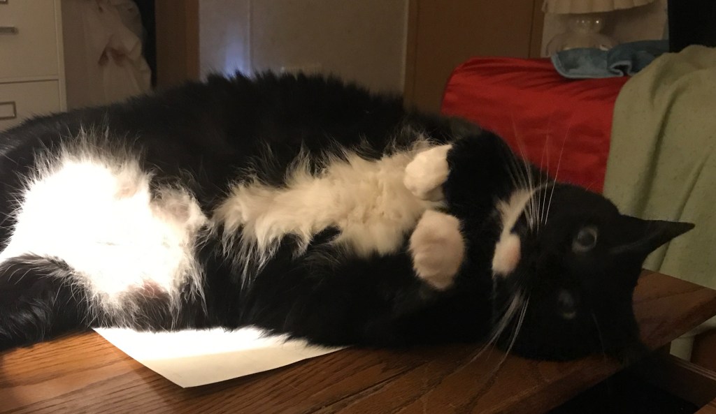 She also has a weird patch on her back that is from me treating a sore on her back and I had shaved a small patch so I could treat the sore. That patch has never been the same. The sore healed up, but the fur doesn’t grow in normally and she is sensitive to touch back there. For that, the (worthless) vet said it was fleas, but none of the cats have fleas and haven’t since living with us because they are all flea-treated indoor cats and this was way before Neville happened, let alone Ollie. We don’t always get a stupid vet but we did for her appointment.