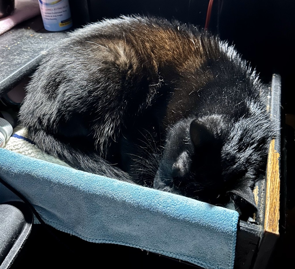 She turned 10 years old on my brother’s birthday. Even though she was for me, she is Adam’s cat. I think she is a one-cat-household cat, so I don’t think she has been happy for quite a while. I really failed her when I took Merlin in. Girl can hold a grudge, just like her mother. I am really going to miss her but the poor thing has had a rough life, dealing with cats she doesn’t like and then dogs. At least the pups don’t bother her physically. And now I’ve upset myself. Until next time!