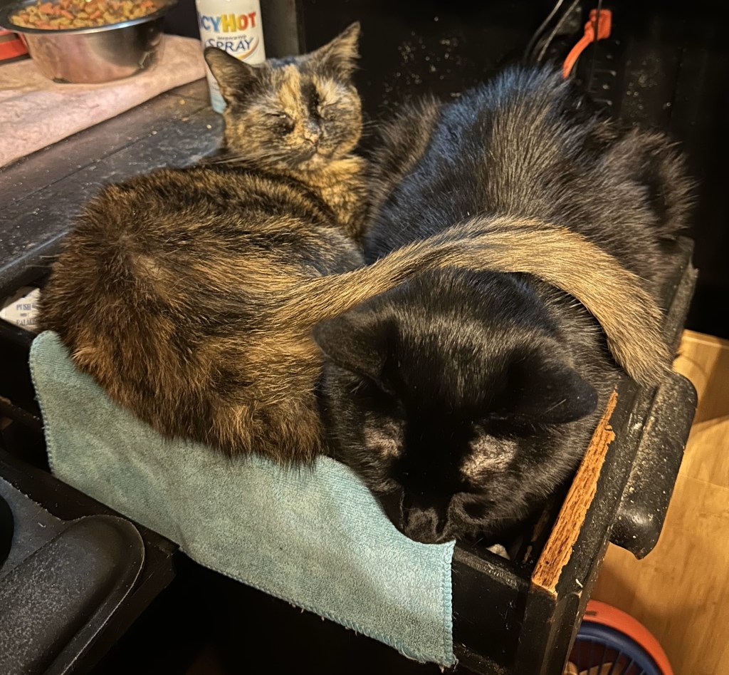 Piper Paws is the cat Mom made Adam promise to get me before Mom died. She is also named after Mom as Mom’s initials are PAWS. I don’t know how I am going to handle losing her. It’s unbearable grief now and she is not gone yet. She has started using the bathroom exclusively on the kitchen table and she can’t walk well because of her (untreated thanks to the vet) leg and her weight. We watch their food, but I cannot put her on a diet food when her siblings are all healthy weights.