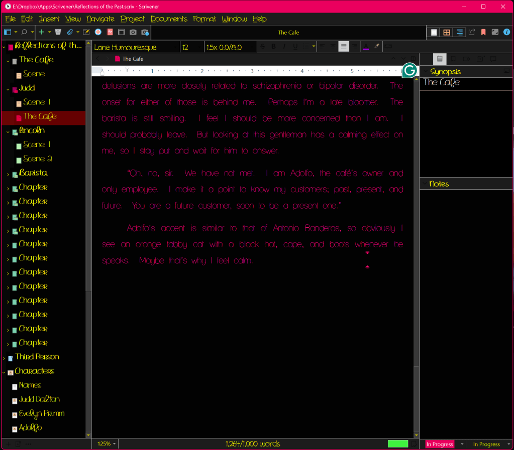 Oh, and authors, if you want a great program to do your writing on, you have to get Scrivener! It is the best writing/editing program I’ve ever used. There’s a steep learning curve with it but after you get comfortable, it seems like the features are very intuitive. Plus, there are tutorials users have written which are very helpful. I’ll screenshot below, which is the program with a theme I selected (Mellow Yellow). The normal program is normal colors and normal font 😊. For $60, it is a steal, and no subscription! I used it to do my poetry collection, and the ebook and print copies look very professional.