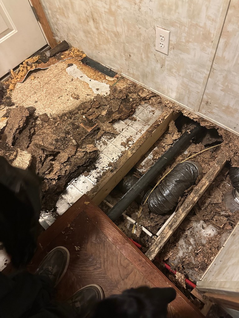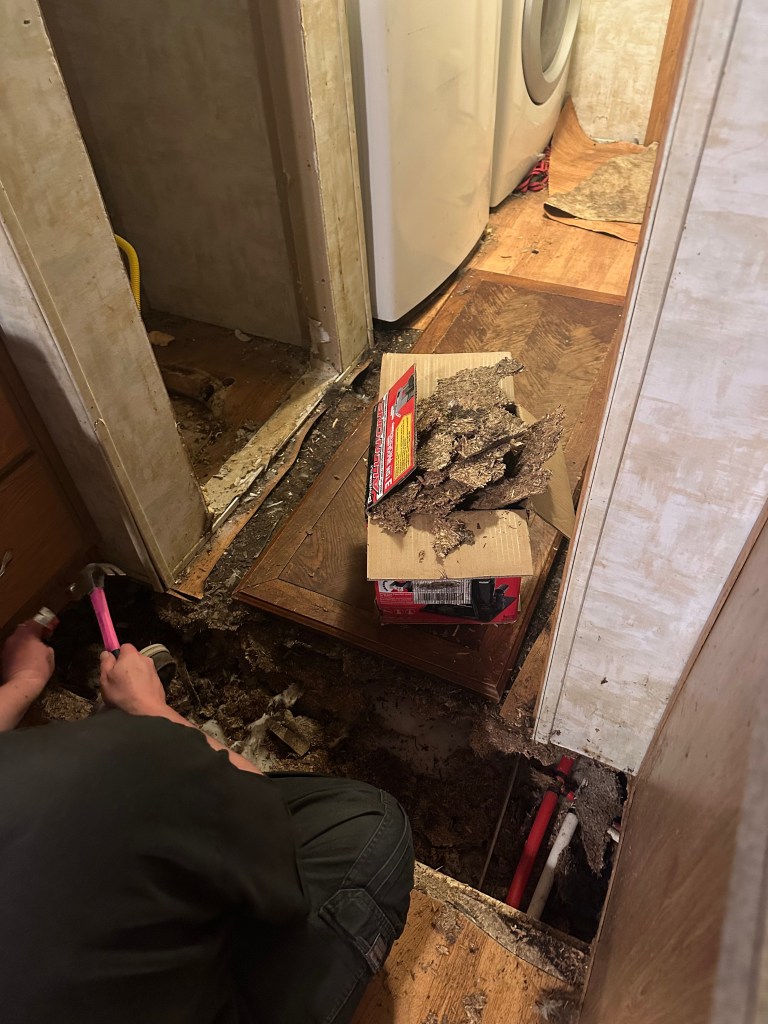 Fast-forward to last September, when I noticed the floor from the water heater and furnace alcoves, which are opposite each other, and coming into the kitchen felt more like rubber than OSB. We have a few weak spots in the entire house, which didn’t surprise me for a 20-year-old foundationed double-wide with no renovations to date, and only general maintenance. The spots are in high-traffic areas, with one being where the house halves meet in the middle of the living room, which has been weakish since Mom was alive pre-2014.