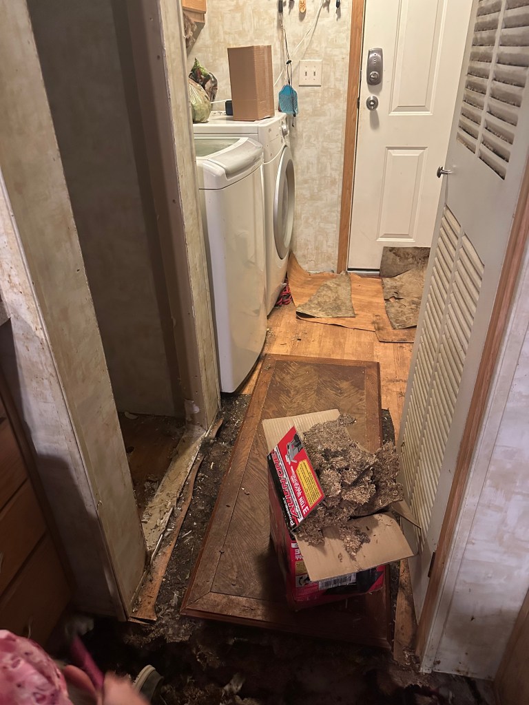 Just like with Mom’s car, I have no options or means to right this wrong that the “professional” committed. The floor from the side door (the utility room with the washer and dryer and standalone freezer) to some of the kitchen is ruined, and subfloor and flooring needs replaced. No home insurance because I still don’t know how to get Mom’s deed and get my name on it, not that I could afford the insurance, anyway.