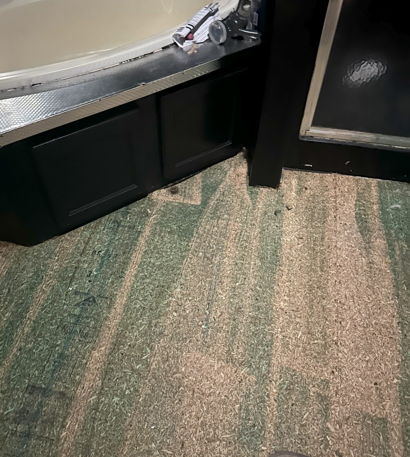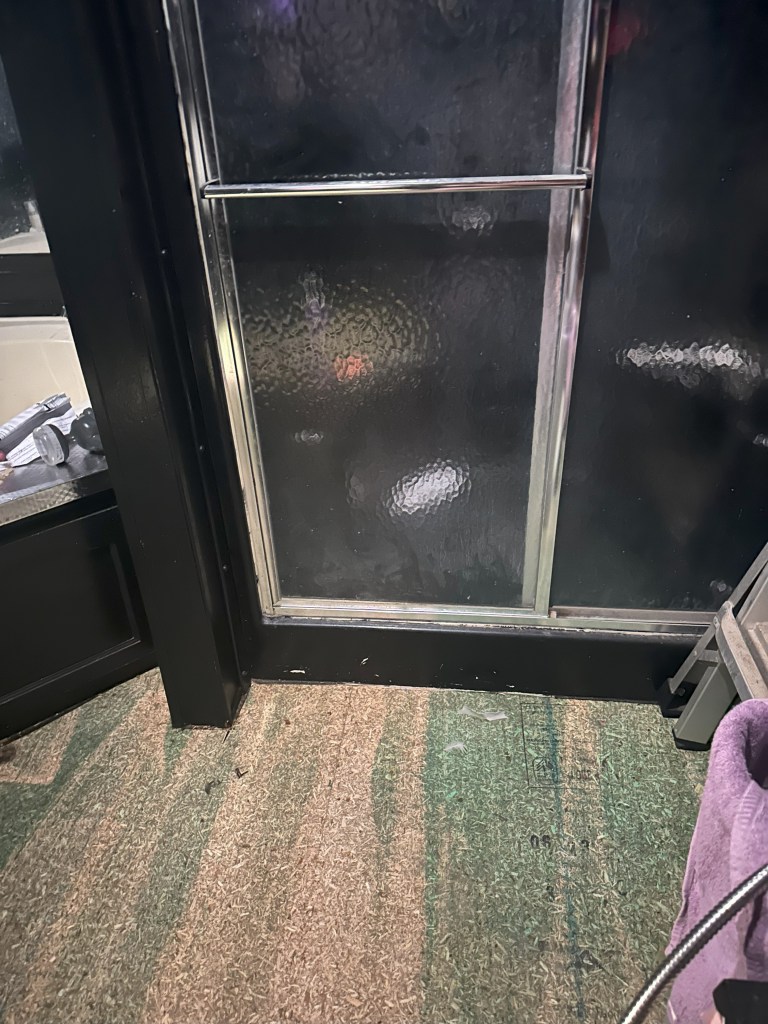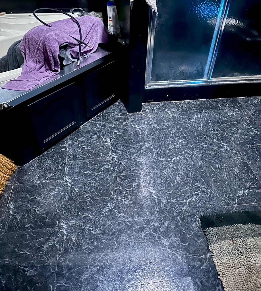 One good thing is that the bathroom floor is almost done. What partially negates that is I can feel it give where Piper peed on the floor near the wall now that the sheet flooring is up 😒. Part of the floor will need to be replaced, maybe 1′ x 3′, which means the tiles we placed will need to come up, and I don’t think they will re-stick. Hopefully, I have enough left over. All that the floor needs now, on the good parts, is black caulking around the perimeter after Adam straightens some of the tiles. The photos really wash the floor out. It is black with marbly-looking veins.