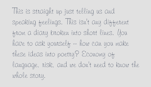For my poetry workshop, we have weekly journals and I think I may have gotten too comfortable with this week’s journal. I didn’t mask at all while typing it up and I think it’s pretty obvious. But it’s a journal and that, to me, implies that it is more relaxed and casual than academic papers. We had to break up a poem that was in paragraph form without knowing how the author broke it up and explain our process/reasoning. I’ve not read that poem before and didn’t look it up since we were told not to so I don’t know how accurate I was. I will find out next week, I guess. I will paste my erratic “reflection” on breaking up said poem below. I’m not posting the poem because I don’t know who wrote it and can’t give credit.