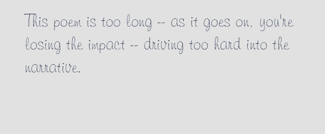 These comments are not helpful or useful. My poem is “too long,” but as I just told Adam, Whitman’s Song of Myself is over 52 pages. A certain part is confusing to her (which I was rudely reprimanded for saying the same thing about two poems) and therefore not needed, and one poem is nothing more than a journal entry. She didn’t say anything at all about one poem. Oh, and she said I “should be” writing in free verse. Um, why? Last I checked, poets could write in whatever form they wished. Louisa May Alcott rhymed. Dr. Seuss rhymed. Whitman, Dickinson, Frost, Pound, Thomas…all wrote poems that rhymed. Every poem I submitted was free verse, btw.