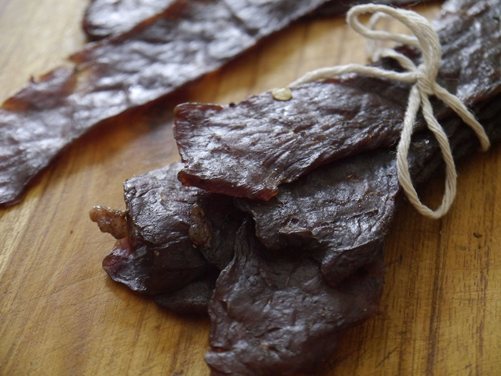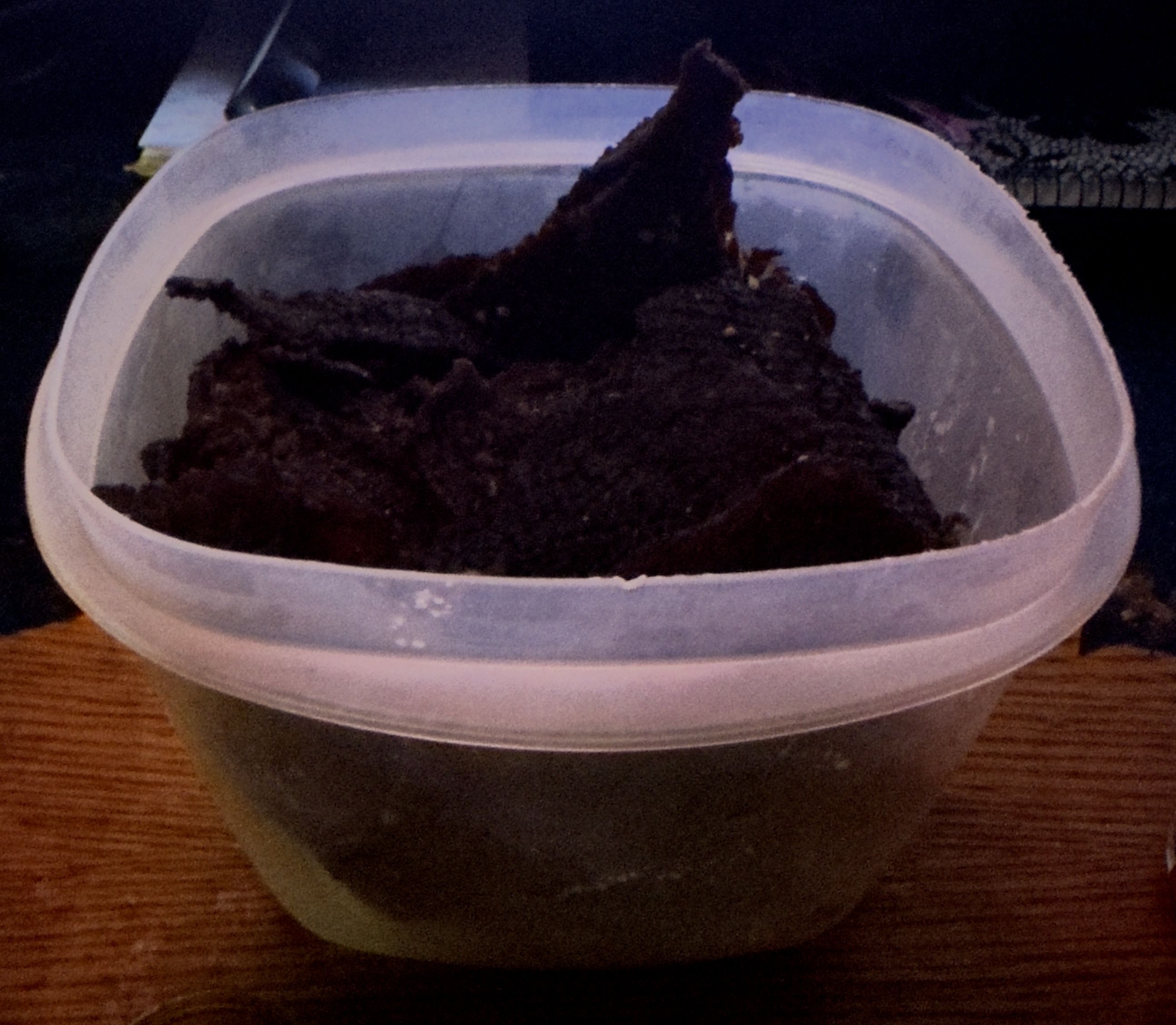 Above is my freshly made beef jerky in a Rubbermaid bowl that has seen better days and seems to have some rough edges around the top, probably from being put in the microwave for too long and too many times. It’s sitting on my desk, which is still part wood color and part black because I got tired of painting it and moved on to the bathroom an embarrassing amount of weeks ago. To top it off, I took the picture in terrible lighting and it’s all grainy. The jerky, however, looks good and tastes great.