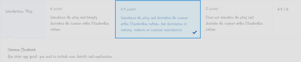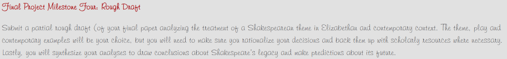 Since she has pissed me off, and I can be petty, I included a quote from her announcement about not needing to summarize the play (in-text citation and including her in the references) and am doing a play-by-play of The Taming of the Shrew and the movie 10 Things I Hate About You since I am so “vague.” I go through the rubric point by point to make sure I cover everything, and I have taken 300-level classes before and aced them, so I do not believe I am missing something.